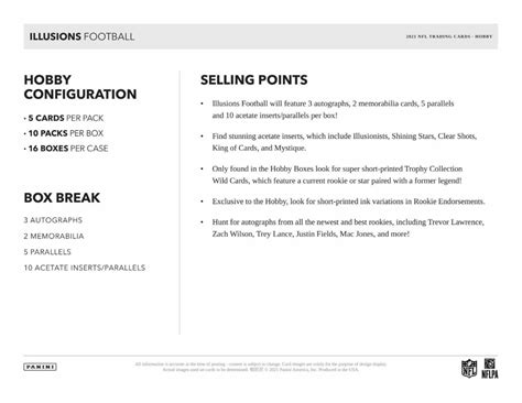 These databases often include images of the cards, as well as information on their rarity, values, and variations. Alternatively, you can create your own checklist using a spreadsheet or a dedicated card collecting app. When creating your checklist, be sure to include all the relevant details, such as the card number, player name, team, and any special features or attributes. Additionally, consider adding columns for tracking the card’s condition, grade, and estimated value. A well-organized checklist will not only help you stay on top of your collection but also provide valuable insights into its overall value and potential growth. Whether you’re a seasoned collector or just starting out, a checklist is an indispensable tool for navigating the complex and exciting world of football card collecting. So, grab your checklist and start building your dream 2021 Illusions Football collection today!