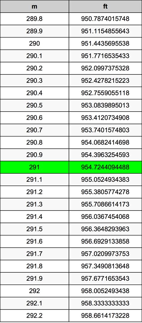 So, 291 meters is equal to approximately 954.72 feet . See? Not so scary when you break it down! You just take the number of meters you have and multiply it by that magical 3.28084. If you’re doing this on a calculator, just punch in 291, hit the multiplication button, type in 3.28084, and voilà! You get your answer. For those who like to visualize, imagine laying out 291 meter-long rulers end-to-end. Then, for each of those meter rulers, you’re laying out a little over three 1-foot rulers next to it. The total length of all those 1-foot rulers combined is what we’re calculating. It’s a straightforward multiplication, and the result gives you the equivalent length in feet. It’s a fundamental skill that can save you time and prevent confusion when dealing with different measurement systems. Remember, the key is the multiplication. Always multiply meters by 3.28084 to get feet. If you ever need to convert the other way around (feet to meters), you would divide by 3.28084. Keeping these simple rules in mind will make unit conversions a breeze. This process is widely used in various fields, including construction, aviation, and even in everyday activities like following recipes from different countries. So, mastering this simple calculation is a practical skill that pays off.