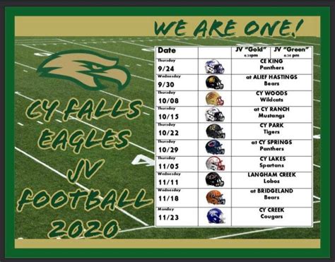 Hey guys! Are you ready for some football? If you’re a fan of the Cy Falls Eagles, then you’re in the right place! This guide is your one-stop shop for everything you need to know about the Cy Falls football schedule . We’re talking game dates, times, opponents, and all the juicy details to help you plan your fall and make sure you don’t miss a single play. So, grab your jerseys, get your face paint ready, and let’s dive into the exciting world of Cy Falls football! We’ll cover everything from the regular season matchups to the potential playoff scenarios, ensuring you’re fully informed and prepared to cheer on our Eagles. Get ready to mark your calendars, because this season is going to be epic. We’ll also provide some tips on how to follow the team, where to find the latest updates, and how to connect with other passionate fans. Let’s make this season unforgettable!