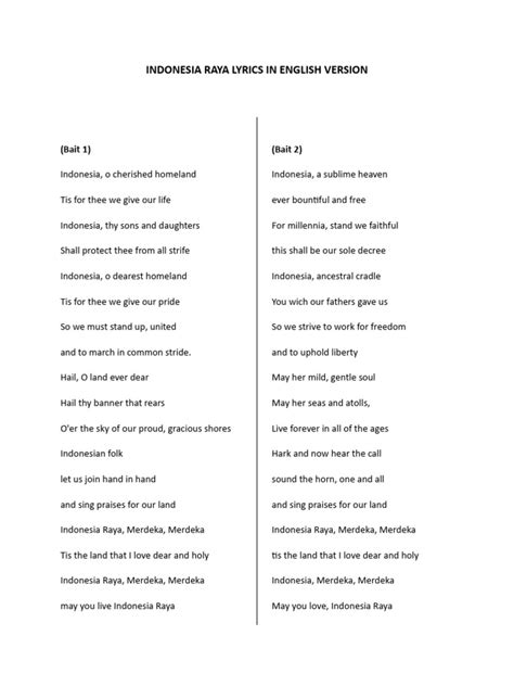 Alright, first things first, why is it so important to have access to the Indonesia Raya lyrics ? Well, let me tell you, guys, this isn’t just some random song; it’s a powerful symbol of Indonesia’s history, unity, and national pride. The anthem itself is a declaration of the spirit of the Indonesian people, a call to stand together, and a reminder of the values that bind the nation. When you download the Indonesia Raya lyrics PDF , you’re not just getting words on a page; you’re connecting with a deep sense of identity and belonging. The anthem is sung on countless occasions – from flag-raising ceremonies at school to national celebrations and international events where Indonesia is represented. Knowing the lyrics allows you to participate fully, showing respect and demonstrating your love for the country. It’s also crucial for educational purposes. Students learn the lyrics to understand their meaning and significance in Indonesian history and culture. By having the PDF, they can easily access, study, and memorize the lyrics. Moreover, the Indonesia Raya lyrics are a reminder of the sacrifices made for Indonesia’s independence. Each word carries the weight of history, inspiring patriotism and a sense of responsibility toward the nation. It encourages citizens to uphold the values of unity, justice, and prosperity for all. When you can recite the lyrics, you are actively participating in preserving and promoting the values of the nation. For those living abroad, having the Indonesia Raya lyrics PDF is also incredibly helpful. It helps maintain a connection to your homeland, especially when you are far away. Singing the anthem can evoke memories and a feeling of connection to your cultural roots. It helps in introducing Indonesian culture to others, as the lyrics tell a story of Indonesia’s spirit and values. The lyrics are also a perfect opportunity to teach children about their cultural heritage, fostering a sense of pride and belonging from a young age. Let’s not forget the emotional impact of the anthem. For many Indonesians, hearing or singing Indonesia Raya evokes powerful feelings of patriotism, unity, and hope. It’s a call to action and a reminder of the shared values that the nation holds dear. Whether you’re a student, an expatriate, or simply someone interested in Indonesian culture, the ability to access and understand the lyrics is a cornerstone of your journey.