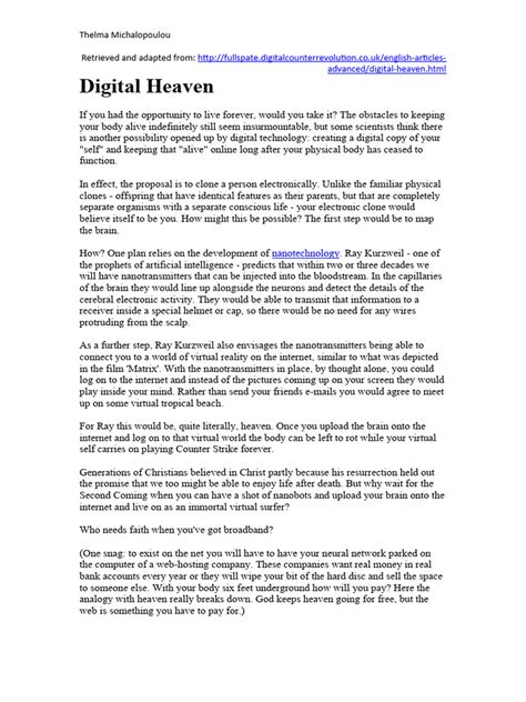 In this digital heaven , there would be no more digital divide, no more online harassment, and no more concerns about privacy or security. Technology would be used to empower individuals, to connect communities, and to create a more just and equitable world. Of course, this is just a utopian vision, and the reality is likely to be far more complex. But it’s important to have aspirational goals to guide our development of technology and to ensure that we are using it for the benefit of humanity.