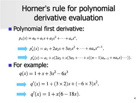 Suppose we have the polynomial P(x) = x³ + 2x² + 3x + 4 and we want to evaluate it at x = 2 . The first step is to rewrite the polynomial using Horner’s Scheme : P(x) = 4 + x(3 + x(2 + x(1))) . Then, substitute x = 2 : P(2) = 4 + 2(3 + 2(2 + 2(1))) . Now, we do the calculations from the inside out: P(2) = 4 + 2(3 + 2(4)) = 4 + 2(3 + 8) = 4 + 2(11) = 4 + 22 = 26 . So, the value of the polynomial at x = 2 is 26. This is straightforward and illustrates the simplicity of the approach. Always double-check your calculations to ensure accuracy.