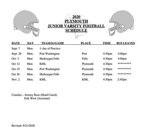 • Where can I find the most accurate junior varsity football schedule? The most accurate schedules are usually found on the high school athletic website or through official league channels. These sources are updated regularly and are the most reliable. Checking multiple sources, such as local news outlets and social media, can also keep you informed of any late changes.
