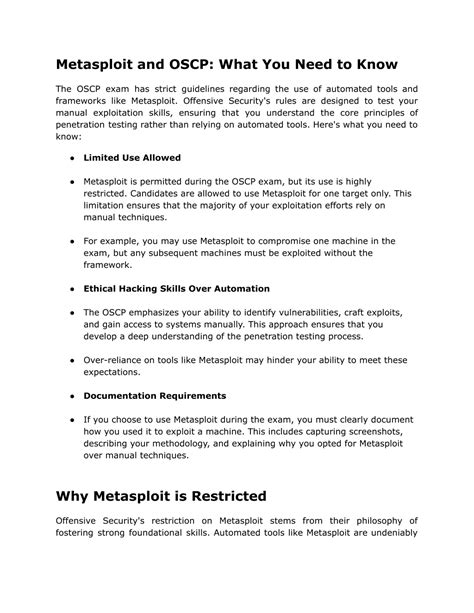So, let’s get straight to the heart of the matter, guys: is Metasploit allowed in the OSCP exam? The short answer is yes, but with significant limitations . Offensive Security, the creators of the OSCP, are very clear about their philosophy. They want you to understand the fundamentals of penetration testing. They want you to be able to do things manually, to understand how an exploit works, not just blindly run a module. This means that while you can use Metasploit, you absolutely cannot rely on it as your sole or primary tool. The OSCP exam is designed to test your ability to identify vulnerabilities, craft custom exploits (or adapt existing ones), and perform manual post-exploitation. If you simply fire up Metasploit, search for a known exploit for a vulnerable service, run it, get a shell, and then move on, you’re likely going to fall short. The exam setters are smart; they know what the common Metasploit modules do. They’ll often have systems that are patched against common exploits, or they’ll require techniques that aren’t easily automated by a simple Metasploit command. Therefore, understanding when and how to use Metasploit judiciously is key. Think of it as a supplementary tool, not a magic bullet. You might use it for initial reconnaissance, or perhaps to quickly gain a foothold on a less critical machine, but the real challenges, the ones that require deep technical understanding and creative problem-solving, will likely demand more manual approaches. It’s about proving you have the underlying knowledge and skills, not just the ability to click buttons in a framework. So, while you can technically use it, don’t let it become a crutch. Your preparation should focus heavily on manual exploitation techniques, understanding buffer overflows, race conditions, and various web vulnerabilities, and then perhaps using Metasploit to accelerate a specific, well-understood part of the process if it makes sense. Getting this balance right is vital for passing the OSCP.
