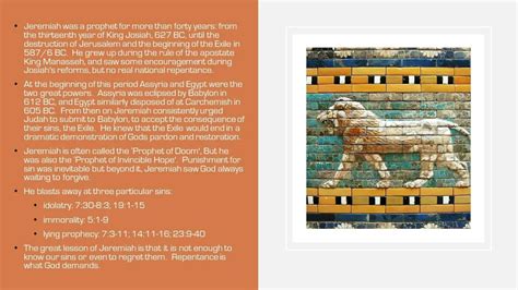 Finally, Jeremiah’s life teaches us the importance of hope . Even in the darkest of times, he held onto hope. He believed that God’s plan would ultimately prevail, and he continued to trust in God’s promises. This teaches us the importance of maintaining hope in our own lives, even when things seem bleak. Hope is the fuel that keeps us going, the light that guides us through the darkness. It allows us to believe in a better future, to keep striving towards our goals, and to have faith that things will eventually work out. Hope gives us the strength to face each day. It keeps us moving forward, even when it feels difficult. It enables us to have faith in the future, even when the present seems challenging. It is the belief that things will get better. Jeremiah teaches us that hope is not just a passive emotion. It is an active choice. It’s a decision to believe in something better, even when there’s no visible evidence of it. Jeremiah’s message of hope resonates powerfully in today’s world. This is especially true when we’re constantly bombarded with negative news and challenges. Hope is essential to maintaining our mental well-being and our faith. Jeremiah’s story, with its emphasis on these things, provides a roadmap for those seeking deeper meaning and personal growth.