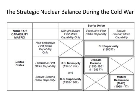 1. Capability: This refers to having a sufficient number of nuclear weapons and delivery systems to inflict unacceptable damage on an adversary. Both the US and the Soviet Union invested heavily in building up their nuclear arsenals, developing a wide range of weapons, from intercontinental ballistic missiles (ICBMs) to submarine-launched ballistic missiles (SLBMs) and strategic bombers.