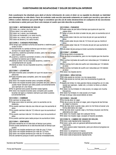 Furthermore, the ODI aids in tailoring treatment plans to meet individual needs. By identifying specific areas of difficulty, such as lifting, walking, or sleeping, healthcare providers can develop targeted interventions to address these issues. For example, if a patient reports significant difficulty with lifting, the treatment plan might include exercises to strengthen the back and core muscles, along with education on proper lifting techniques. Similarly, if sleeping is a major problem, strategies to improve sleep hygiene and manage pain at night can be incorporated. This personalized approach ensures that patients receive the most effective and appropriate care for their specific challenges.