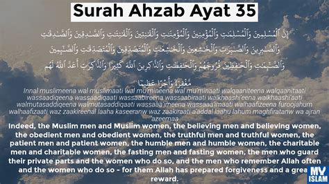 Alright, let’s turn our attention to verse 35 of Surah Al-Ahzab , which is arguably one of the most beautiful and empowering verses in the Quran. This verse beautifully outlines the equal rewards promised by Allah (SWT) for both men and women who strive for piety and righteousness. It’s a powerful affirmation of gender equality in Islam, emphasizing that spiritual growth and divine rewards are not exclusive to any gender. The verse lists a series of qualities and actions, highlighting that both men and women who embody these virtues are deserving of Allah’s forgiveness and a great reward . It’s a truly inclusive message that resonates with the core principles of justice and fairness in Islam.