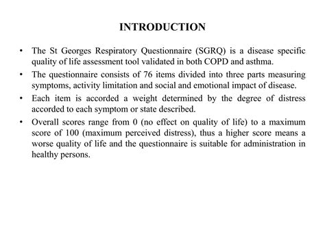 So, first things first, let’s get a solid grasp on the St. George’s Respiratory Questionnaire (SGRQ) itself. Think of the SGRQ as a patient-reported outcome measure (PROM). This means it’s a questionnaire that you , the patient, fill out to tell us how you’re really feeling and how your COPD is impacting your day-to-day life. It’s not something a doctor measures with a stethoscope or a breathing test; it’s your personal experience translated into a score. This questionnaire is pretty comprehensive, covering three main domains: Symptoms , Activity , and Impact . The Symptoms domain dives deep into how often you experience cough, phlegm, and wheezing. It gets pretty detailed, asking about the frequency and severity of these common COPD woes. Then there’s the Activity domain, which focuses on how your breathing limitations affect your ability to perform everyday physical activities. We’re talking about things like walking, climbing stairs, carrying shopping, or even just getting dressed. It really tries to capture the physical burden of the disease. Finally, the Impact domain looks at the broader consequences of COPD on your life. This includes things like anxiety, depression, social limitations, and overall well-being. It acknowledges that COPD isn’t just a physical ailment; it has a massive psychological and social component too. The SGRQ score ranges from 0 to 100, with a higher score indicating worse health status . A score of 0 would mean you feel perfectly healthy, which, let’s be real, is pretty unlikely for someone with COPD. Conversely, a score of 100 would mean your health is severely compromised. It’s widely used in clinical trials and everyday practice because it’s considered a reliable and valid tool for assessing the burden of COPD. It helps doctors and researchers get a holistic view of how a patient is doing, going beyond just lung function numbers. But, and this is a crucial ‘but’, just looking at a raw score change can be a bit misleading. That’s where our next topic, the MCID, becomes absolutely essential for making sense of these SGRQ scores.