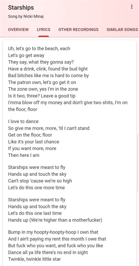 Alright, guys, we’ve done the work! We’ve dissected the original, figured out the edits, and now we have the ultimate clean version of “Starships” lyrics ready for you to blast. This is your go-to for parties, car rides, study sessions, or anytime you need that epic boost of energy and confidence. The goal was to keep the spirit, the rhythm, and the sheer fun of Nicki Minaj’s hit song intact, while making sure it’s suitable for every single ear. So, let’s imagine you’ve got your speakers ready, your friends are hyped, and you’re about to hit play. You’ll hear that iconic intro, feel the beat drop, and then Nicki’s voice comes in, full of that signature swagger. The verses will flow with all the confidence and party vibes, but instead of any potentially questionable language , you’ll find smooth, energetic phrasing that keeps the momentum going. We’ve swapped out those words that might make you wince for ones that still convey the excitement and the feeling of being on top of the world. Think of lines that now perfectly capture the essence of letting loose and having an amazing time, without a single worry about who might overhear. The chorus, of course, remains that magical, soaring anthem we all know and love: “Starships were meant to fly / Fly me to the moon and let me play among the stars / Let me see what spring is like on Jupiter and Mars / In other words, hold my hand / In other words, baby, baby.” This part is pure bliss and universally uplifting. The bridge and any other sections that might have original mature content have been carefully rephrased to maintain the song’s powerful message and its infectious energy . You’ll find yourself singing along just as enthusiastically, hitting every beat, and feeling every bit of the song’s exhilaration. This clean version is designed to be your all-access pass to the “Starships” experience. No more awkward pauses, no more skipping sections, just pure, unadulterated fun from start to finish. It’s perfect for when you’re curating a playlist for a family gathering , creating content for social media, or simply want to sing your heart out in your room without any restrictions. This version ensures that the empowering and joyful spirit of “Starships” can be shared and celebrated by absolutely everyone. So, go ahead, turn up the volume, and let those clean lyrics take you on a journey. You can now enjoy this absolute banger with complete peace of mind, knowing it’s playlist-perfect and crowd-pleasing . “Starships” is all about reaching for the sky, and with these clean lyrics, nothing is holding you back from enjoying every single moment. Let’s keep the music loud and the vibes immaculate, everyone! This is your ultimate, family-friendly “Starships” singalong – enjoy every second of it!