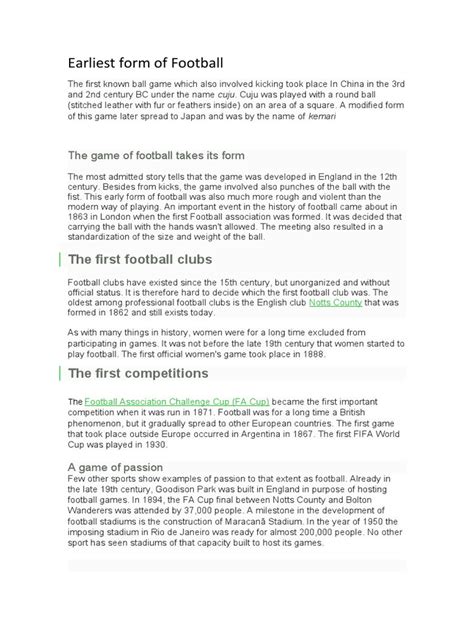 When was football born? Guys, let’s dive into the fascinating history of football, tracing its roots from ancient civilizations to the modern game we all know and love. Football, in its various forms, has been around for centuries, with evidence suggesting that games involving kicking a ball were played in ancient China as early as the 2nd and 3rd centuries BC. This early version of the game, known as Cuju , involved kicking a leather ball stuffed with feathers and hair into a net stretched between bamboo canes. Cuju was not just a sport; it was also used as military training, promoting physical fitness and discipline among soldiers. Can you imagine soldiers practicing their kicks and tackles instead of just drills? That’s how ingrained football was in their culture!