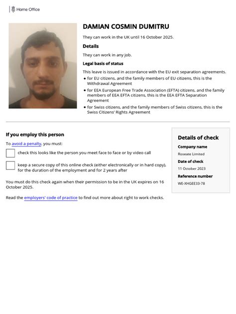 Once you have these essential pieces of information, you’ll need to visit the official Gov.uk website. Look for the service titled “ Check a job applicant’s right to work ”. This is the dedicated online service provided by the Home Office for employers. When you access this portal, you’ll be prompted to enter the share code provided by the individual, along with their exact date of birth. Double-check these details for accuracy, as even a minor typo in the share code or an incorrect date of birth will result in an error, preventing you from accessing their information. After entering the details, the system will process the request and, if everything matches, will display the individual’s immigration status and their specific conditions for working in the UK. This information typically includes their full name, a photograph (which you should always cross-reference with the individual present), their immigration status (e.g., Settled Status under the EU Settlement Scheme, Skilled Worker visa), and any limitations on their right to work, such as restrictions on hours or specific types of employment they are permitted to undertake. It’s imperative that you carefully review all the information displayed to ensure it aligns with the role they are being hired for and that there are no restrictions that would prevent them from performing the job. Once you’ve viewed and verified the information, you must record the date you conducted the check and the unique reference number provided by the online system, or ideally, print and save a copy of the results page. This record-keeping is vital as proof that you have fulfilled your legal obligations. This process ensures a robust and defensible Right to Work check , protecting your business from penalties.