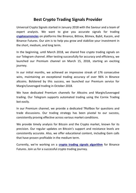 Alright, let’s get down to the nitty-gritty: how do you actually find the best crypto trading signals that won’t leave you crying into your cold pizza? This is where we separate the signal from the noise, folks. It’s not just about finding a signal, but finding a good one. First and foremost, transparency is key . A legitimate signal provider will be upfront about how they generate their signals. Do they use technical indicators, fundamental analysis, news sentiment, or a combination? Do they explain the rationale behind a specific buy or sell recommendation? If a service is super secretive or just says “trust us, we’re good,” that’s a massive red flag. Never invest blindly . Next up, track record and verifiable results . This is crucial. Look for providers who offer historical performance data. But here’s the trick: don’t just take their word for it. Try to find independent reviews, backtesting results, or even live trading proof. Be skeptical of screenshots showing massive profits – these can be easily faked. A truly confident provider will have audited or independently verified performance metrics. Look for consistency over time , not just a few lucky streaks. Thirdly, clear entry, exit, and stop-loss levels . The best signals don’t just say “buy this coin.” They provide specific details: the price to enter the trade, the target price for profit-taking (take-profit), and a level at which to cut your losses (stop-loss). This risk management aspect is non-negotiable. A signal without these parameters is like a car without a steering wheel – dangerous and uncontrolled. Good risk management is paramount . Fourth, community and support . Many reputable signal services have active communities (like Telegram groups or Discord servers) where users can discuss trades, share insights, and ask questions. Having access to support and a community can be invaluable, especially when you’re navigating complex trades or market volatility. It shows the provider is invested in their users’ success. Finally, cost vs. value . While free signals exist, they are often low quality or heavily delayed. Paid signals can range from affordable to eye-wateringly expensive. Evaluate the subscription cost against the potential value you expect to receive. Does the provider offer a free trial? Can you start with a lower-tier plan to test the waters? Don’t break the bank on a service without proper vetting. Remember guys, the best crypto trading signals are tools to assist your trading, not replace your brain. Use them wisely, combine them with your own research, and always, always manage your risk.