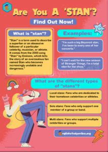 Now, when someone says they “stan” something or someone, they’re essentially saying they are a huge fan. They admire, support, and are passionately devoted to that person or thing. It’s like saying, “I’m a big fan,” but with a whole lot more enthusiasm and commitment. “Stanning” is a verb, the action of being a stan. You can say you “stan” someone, which is the act of being an intense fan of someone or something, or you can describe someone as a “stan,” which refers to the person who has that level of devotion. It’s often used online, in social media, and in conversations among fans. The term carries a connotation of intense admiration, support, and sometimes, a little bit of obsession. It goes beyond just liking something; it’s about being actively involved in supporting and celebrating the object of your affection.